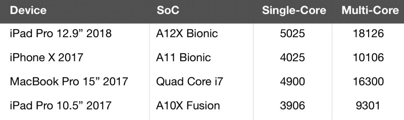 For comparison this is what an iPad Pro 12.9” Benchmarks at compared to an 2017 MacBook Pro 15”, iPad Pro 10.5” and the iPhone X.